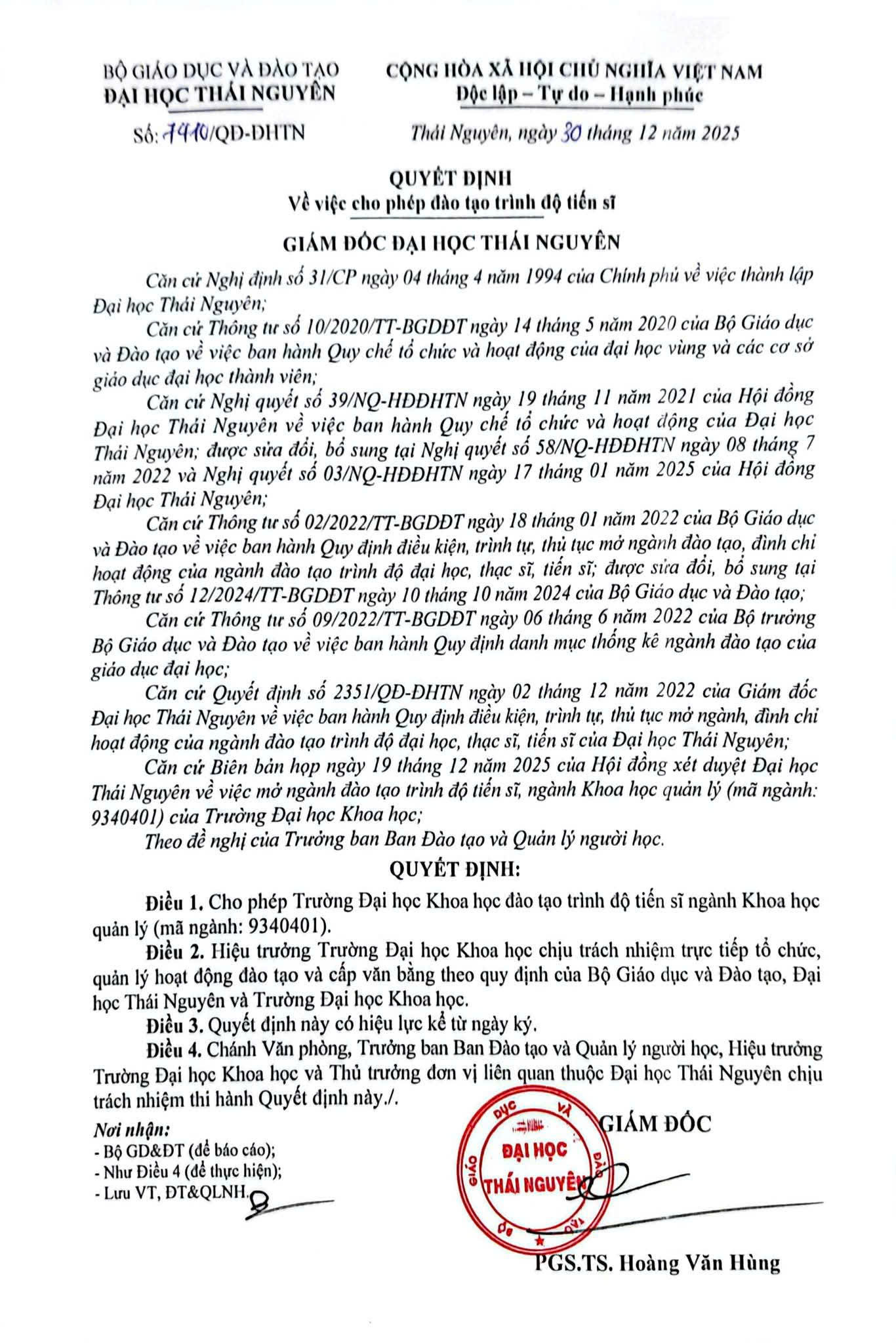Một dấu mốc quan trọng trong năm 2025 của Khoa Khoa học xã hội và Nhân văn là việc Đại học Thái Nguyên ban hành Quyết định số 7410/QĐ-ĐHTN ngày 20/12/2025, cho phép Khoa đào tạo trình độ Tiến sĩ ngành Khoa học quản lý.