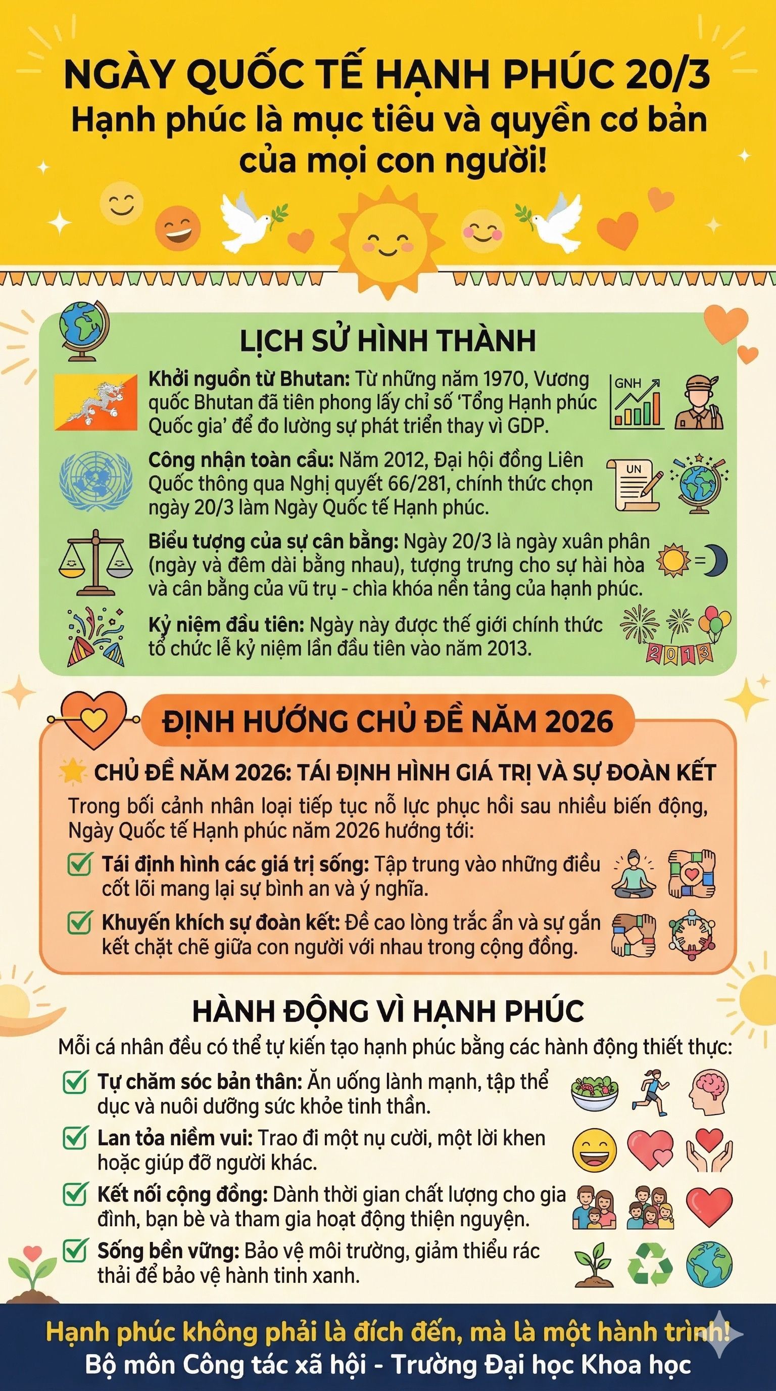 Ngày Quốc tế Hạnh phúc 20/3 không chỉ là một mốc thời gian trên tờ lịch để chúng ta trao nhau những lời chúc tụng. Nó là một lời nhắc nhở rằng: Hạnh phúc là một quyền cơ bản của con người. Trong một thế giới đầy rẫy sự cạnh tranh và những áp lực vô hình, hạnh phúc là một đích đến được xây dựng từ lòng biết ơn, sự sẻ chia và tình yêu thương đồng loại.