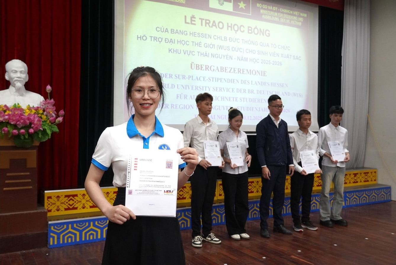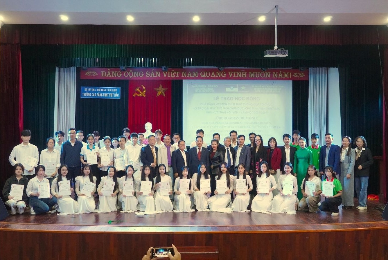 Lễ trao học bổng diễn ra vào ngày 10/12 tại Trường Cao đẳng Văn hóa Nghệ thuật Việt Bắc, do Văn phòng đại diện bang Hessen tại Việt Nam phối hợp với Đại học Thái Nguyên tổ chức. Chương trình nhằm ghi nhận những sinh viên tiêu biểu năm học 2025 – 2026 thuộc khu vực Thái Nguyên và các tỉnh lân cận.